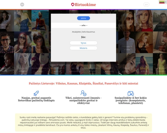 Šiuolaikiniame pasaulyje laikas yra svarbiausias resursas. „Flirtuokime“ tai supranta ir suteikia galimybę pradėti bendrauti vos per minutę. Svetainė leidžia pasirinkti, ko jūs norite: paplepėti, susipažinti ar susirasti draugų. Taip pat yra galimybė pasirinkti, su kuo norite susipažinti — vaikinais, merginomis ar abiem.